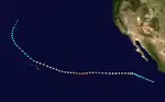 On July 15, the NHC noted that an area of low pressure was forecast to form well south of Mexico early the subsequent week.[88] An area of disturbed weather became established south of the Gulf of Tehuantepec the following day,[89] organizing sufficiently to be deemed a tropical depression by 21:00 UTC on July 21.[90] Despite moderate northeasterly wind shear, the depression intensified into Tropical Storm Georgette by 15:00 UTC on July 22 and was further upgraded to a Category 1 hurricane by 03:00 UTC on July 24.[91][92] Over a 24-hour period ending at 03:00 UTC July 25, the cyclone's maximum winds increased from 75 mph (120 km/h) to a peak of 130 mph (210 km/h) as convection became more symmetric and an eye cleared.[93] Progressively cooler waters and a more stable environment, however, caused Georgette to begin weakening soon thereafter: it fell below hurricane intensity by 15:00 UTC on July 26 and further degenerated into a remnant low well west-southwest of Baja California a day later.[94][95]