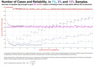 Election audits typically test a sample of machine-counted precincts to see if recounts by hand or machine match the original counts. Mismatches result in either a report or a larger recount. The sampling rates are usually defined by law, not statistical design, so for a legally defined sample size n, what is the probability of missing a problem which is present in K precincts, such as a hack or bug? This is the probability that {{nobr| k = 0 . Bugs are often obscure, and a hacker can minimize detection by affecting only a few precincts, which will still affect close elections, so a plausible scenario is for K to be on the order of 5% of N. Audits typically cover 1% to 10% of precincts (often 3%),[9][10][11] so they have a high chance of missing a problem. For example, if a problem is present in 5 of 100 precincts, a 3% sample has 86% probability that k = 0 so the problem would not be noticed, and only 14% probability of the problem appearing in the sample (positive k ):