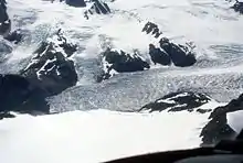 An ice field (also spelled icefield) is a mass of interconnected valley glaciers (also called mountain glaciers or alpine glaciers) on a mountain mass with protruding rock ridges or summits.[1] They are often found in the colder climates and higher altitudes of the world where there is sufficient precipitation for them to form. The higher peaks of the underlying mountain rock that protrude through the icefields are known as nunataks. Ice fields are larger than alpine glaciers, but smaller than ice caps and ice sheets. The topography of ice fields is determined by the shape of the surrounding landforms, while ice caps have their own forms overriding underlying shapes.