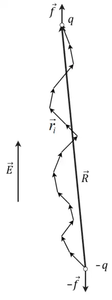 Consider a freely jointed chain of N bonds of length subject to a constant elongational force f applied to its ends along the z axis and an environment temperature . An example could be a chain with two opposite charges +q and -q at its ends in a constant electric field applied along the axis as sketched in the figure on the right. If the direct Coulomb interaction between the charges is ignored, then there is a constant force at the two ends.