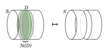 is a new properly embedded surface obtained by compressing S along D.