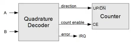 Incremental encoder interfaces commonly use a quadrature decoder to convert the A and B signals into the direction and count enable (clock enable) signals needed for controlling a bidirectional (up- and down-counting) synchronous counter.