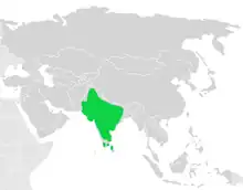 This species occurs in dry stony, scrubby or rocky country but rarely on sandy terrain[11] from the Indus valley east short of Bangladesh and south to the tip of Peninsular India. It sometimes occurs in the dry zone of northern Sri Lanka. The wet forest zones are avoided. In southern India, the drier zone on the east coast, the Coromandel region, where it is not uncommon[12] gives it the species name. It is also found patchily distributed in other parts of the peninsula.[13][14] Other areas where they are commonly seen include the Deccan plateau and the arid regions of northwestern India in Rajasthan and Gujarat.[15] It is resident in some areas but makes local movements.[16][17]