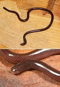 Adults measure 2–4 inches (5.1–10.2 cm) long, uncommonly to 6 inches (15 cm), making it the smallest known snake species. The head and tail are superficially similar as the head and neck are indistinct. Unlike other snakes, the head scales resemble the body scales. The eyes are barely discernible as small dots under the head scales. The tip of the tail has a small, pointed spur. Along the body are fourteen rows of dorsal scales. Coloration ranges from charcoal gray, silver-gray, light yellow-beige, purplish, or infrequently albino, the ventral surface more pale. Coloration of the juvenile form is similar to that of the adult. Behavior ranges from lethargic in appropriate habitat to energetic, quickly seeking the cover of soil or leaf litter to avoid light.[6][7][8]