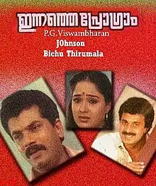 Innathe Program is a 1991 Indian Malayalam film, directed by P. G. Vishwambharan and produced by Changanassery Basheer. The film stars Mukesh, Siddique, Radha (in her final Malayalam film to date), A. C. Zainuddin and Philomina in the lead roles. The film has musical score by Johnson.[1][2][3]