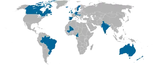 Australia, Austria, Bangladesh, Belgium, Brazil, Cameroon, Canada, Denmark, East Africa region, Germany, Hungary, Iceland, India, Ireland, Italy, Luxembourg, Mali, Malta, Nepal, New Zealand, Nigeria, Pakistan, Spain, Sweden, Switzerland, United Kingdom and Uruguay
