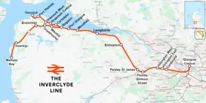 The Inverclyde Line is a railway line running from Glasgow Central station through Paisley (Gilmour Street) and a series of stations to the south of the River Clyde and the Firth of Clyde, terminating at Gourock and Wemyss Bay, where it connects to Caledonian MacBrayne ferry services. The line has been in operation since the 1840s between Glasgow and Greenock and was the first passenger service to follow the River Clyde to the coast. The line was electrified in 1967.