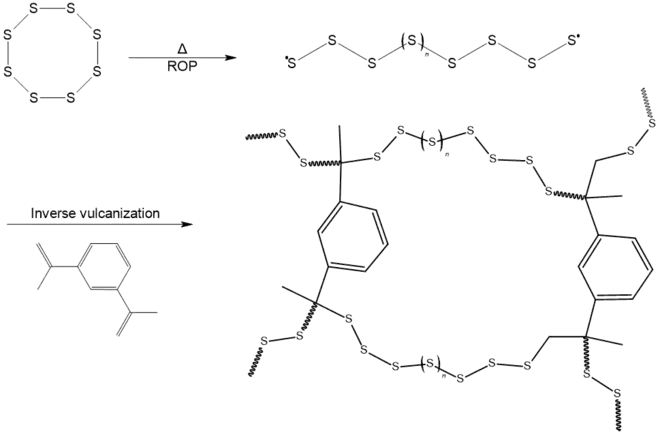 The polymerization process begins with the heating of elemental sulfur above its melting point (115.21 °C), to favor the ring-opening polymerization process (ROP) of the S8 monomer, occurring at 159 °C. As a result, the liquid sulfur is constituted by linear polysulfide chains with diradical ends, which can be easily bridged together with small dienes, such as 1,3-Diisopropylbenzene(DIB),[1] 1,4-diphenylbutadiyne,[2] limonene,[3] divinylbenzene (DVB),[4] dicyclopentadiene,[5] styrene,[6] 4-vinylpyridine,[7] cycloalkene[8] and ethylidene norbornene,[9] or longer organic molecules as polybenzoxazines,[10] squalene[11] and triglyceride.[12] Chemically, the diene carbon-carbon double bond (C=C) of the substitutional group disappears, forming the carbon-sulfur single bond (C-S) which binds together the sulfur linear chains. The advantage of such a polymerization is the absence of a solvent; Sulphur acts as comonomer and solvent. This makes the process highly scalable at the industrial level, and kilogram-scale synthesis of the poly(S-r-DIB) has already been accomplished.[13]