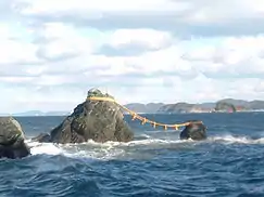 - The Wedded Rocks (夫婦岩, meoto-iwa): Located at Futami Okitama Shrine (二見興玉神社) in northeastern Ise. The rocks have been enshrined and are thus considered gods. The picture was taken at high tide. At low tide the scene is less dramatic.