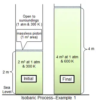 In the first process example, a cylindrical chamber 1 m2 in area encloses 81.2438 mol of an ideal diatomic gas of molecular mass 29 g mol−1 at 300 K. The surrounding gas is at 1 atm and 300 K, and separated from the cylinder gas by a thin piston. For the limiting case of a massless piston, the cylinder gas is also at 1 atm pressure, with an initial volume of 2 m3. Heat is added slowly until the gas temperature is uniformly 600 K, after which the gas volume is 4 m3 and the piston is 2 m above its initial position. If the piston motion is sufficiently slow, the gas pressure at each instant will have practically the same value (psys = 1 atm) throughout.