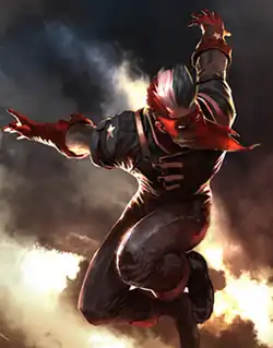 During a bank robbery, Jack intervened and stepped on Rock Python and Fer-de-Lance (both of whom were members of the Serpent Society). Shortly after this, Jack attempted to infiltrate the Society, but King Cobra did not fully trust Flag. King Cobra sent Jack to steal a painting from Mr. Hyde, who severely beat Jack. While fighting, Hyde's chemicals drenched Jack and he developed superhuman physical abilities. After receiving his new powers, Flag easily defeated Mr. Hyde and retrieved the painting. Before returning the painting to King Cobra, Flag contacted Captain America's hotline and informed them that the Serpent Society was in Sandhaven.[2] Impressed that he was able to defeat Mr. Hyde, Cobra tried out Jack as a new King Cobra. While Flag was undercover with the Serpent Society, Captain America, and his protégé, Free Spirit, showed up to aid Jack and defeat the Society. Jack followed Captain America and Free Spirit east, aiding them against ULTIMATUM, AIM, and Madcap. When Captain America believed he was dying, he charged Jack Flag, Free Spirit, Fabian Stankowicz and Zach Moonhunter with maintaining his hotline.[3]