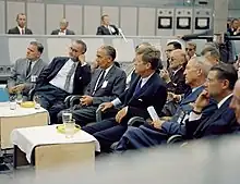 Webb, Vice President Lyndon Johnson, Kurt H. Debus, and President John F. Kennedy receive a briefing on Saturn I launch operations during a tour of Launch Complex 34, September 1962.