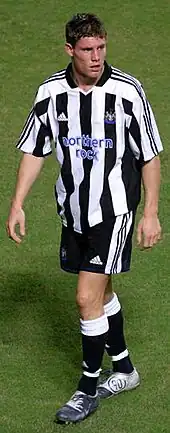However, Leeds' fortunes were on the decline; the team became the subject of numerous negative stories in the media, and several first-team players were sold.[33] Milner said he believed that this experience made him emotionally stronger and taught him how to deal with team problems.[16] Leeds' eventual relegation to the Championship led to speculation over Milner's future at the club. Tottenham Hotspur, Aston Villa and Everton all expressed an interest in signing him.[22] Ultimately, Villa and Everton did not make offers and Milner rejected an offer from Tottenham as they were based too far from his family home, where he still lived.[34][35] Leeds insisted that he would not be sold with chairman Gerald Krasner referring to him as "the future of Leeds".[16] Nonetheless, financial problems eventually forced Leeds to sell Milner to Newcastle United for £5 million.[36] Although Milner was not happy to be leaving the club he had supported as a child, he wished to do what was "in the club's best interest"[16] and in July 2004, he agreed a five-year contract with Newcastle.[22]