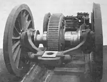 As a result of his investigations, the bogie, later called the Java bogie, was created.[1][2] Its vertical axis of rotation was close to its driven axis, so that the conditions for radial adjustment[3] in curves were optimal for it: the approach angle of the wheels against the rails was reduced. In order to be able to drive through even tighter curves without constraint, the running axis in the bogie that is further away from the axis of rotation was designed as an Adams axle. The guiding force on the outer rail shifted this axis obliquely inwards, the oblique part of the movement causing the axis to adjust radially.