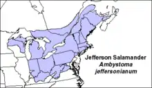 The Jefferson salamander (Ambystoma jeffersonianum) is a mole salamander native to the northeastern United States, southern and central Ontario, and southwestern Quebec. It was named after Jefferson College in Pennsylvania.[2][3]