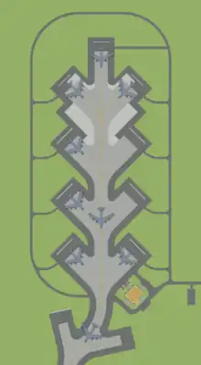 Jet blast deflectors began to appear at airports in the 1950s.[3][4] Airports in the 1960s used jet blast deflectors with a height of 6 to 8 feet (1.8 to 2.4 m), but airports in the 1990s needed deflectors that were twice as high,[5] and even up to 35 feet (11 m) high for jet airliners such as the McDonnell Douglas DC-10 and MD-11, which have engines mounted in the tail above the fuselage.[1] Airports often place their deflectors at the beginnings of runways, especially when roadways or structures are adjacent. Airports that are in dense urban areas often have deflectors between taxiways and airport borders. Jet blast deflectors usually direct exhaust gases upward.[6] However, a low-pressure zone can form behind the blast fence, causing ambient air and debris to be drawn upward with the jet exhaust, and hot, toxic gases to circulate behind the blast fence.[7] Jet blast deflectors have been designed to counteract this problem by using multiple panels and various angles, and by using slotted panel surfaces.[7]