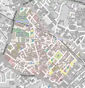 Construction of St Paul's Church, designed by Roger Eykyn, and the surrounding St Paul's Square commenced in 1777 and was completed in 1779.[12] Georgian houses aimed at the prosperous middle class were constructed around the square, some of which survive such as Nos 12–14, which are Grade II listed, on the eastern side of the square.[11] A plan of Birmingham by Thomas Hanson in 1778 shows that most of the Newhall estate had been laid out in a grid-like pattern from St Paul's Church. The plan also showed that two pools, Great and Little Pool, had been filled in and the brook that fed them had been canalised. However New Hall still blocked further development down Newhall Street. In the early 1770s Matthew Boulton had been using the premises partially as a warehouse and when plans for its demolition were aired he resisted them. However the house was demolished in 1787 with only the barn left standing until Boulton's new warehouse was completed on Livery Street in 1788.[9]