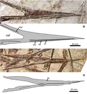 Jidapterus is based on holotype CAD-01, a nearly complete skeleton with partial skull. The skull is toothless and relatively long, with a straight and very pointed beak, and a large hole where the antorbital fenestra is joined with the nostrils. The eye sockets are small, and there is no crest along the lower jaw as seen in ornithocheiroids, although a short projection was present at the back of the skull. The wingspan of this individual was estimated to be 1.7 m (5.6 ft).[1]