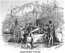 Authorities open the crate containing the body of Adams, – Sutton 1874.