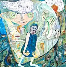 One of the most famous paintings of Jon Serl is Between Two Worlds painted in 1982. It is a seductive painting. The central character stands in the middle wearing a blue dress with his hands gnarled, seeming in pain. Even if the figure is wearing a dress, the figure is a male. His pain seems to come from the fact that everyone in the painting is watching him. His hands and his screaming mouth reflect a tortured face. The two worlds referenced in the title are represented one in a pale bubble and the other one in the darker landscape bordering the central activity. There are many faces overhead the blue character; they are terrifying him. This creates a haunted feeling. Jon Serl spent time on details to create distorted faces and a confused atmosphere around the central figure. Serl succeeded to show the drama in this painting, which is why it is one of Serl's best artwork.[12]