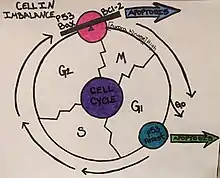 Apoptosis is an important mechanism in regulating K562 cells and can be induced by the changes in the metabolic state of the cells.[12] There are many different cellular components involved in the cycle of apoptosis such as BCR/ABL, Bcl-2, Bax protein, and cytochrome C.[13] The tumor suppressor gene p53 is also important in the cell cycle regulation of K562 cells.[15] This gene targets the cyclin-dependent kinase inhibitor, p21, and causes cell differentiation, cell cycle arrest in G1, and ultimately apoptosis.[15] When the levels of these components are thrown off, they can either no longer inhibit apoptosis of the cancer cells, a role fulfilled by BCR/ABL, or they cause apoptosis to be induced, in the same vein as Bax and cytochrome C.[13] These components are key in the mitochondria, and due to this, it has been supported that apoptosis uses the mitochondrial apoptosis pathway.[13] The offset of these cellular components from their balance point causes morphological changes, which result in the K562 cells being arrested in the G2/M phase of the cell cycle.[13] This arrest leads to “shrinkage, blebbing, nuclear fragmentation, chromatin condensing” and other morphological changes that cause the cell to program death at this point.[13]