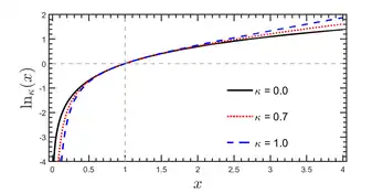 Plot of the κ-logarithmic function for three different κ-values. The solid black curve corresponding to the ordinary logarithmic function ().
