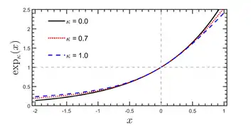 Plot of the κ-exponential function for three different κ-values. The solid black curve corresponding to the ordinary exponential function ().