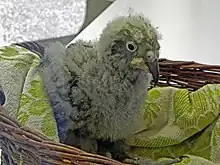 In one study, nest sites occur at a density of one per 4.4 square kilometres (1.7 sq mi).[33] The breeding areas are most commonly in southern beech (Nothofagus) forests, located on steep mountainsides. Breeding at heights of 1,600 metres (5,200 ft) above sea level and higher, it is one of the few parrot species in the world to regularly spend time above the tree line. Nest sites are usually positioned on the ground underneath large beech trees, in rock crevices, or dug burrows between roots. They are accessed by tunnels leading back 1 to 6 metres (3.3 to 19.7 ft) into a larger chamber, which is furnished with lichens, moss, ferns, and rotting wood. The laying period starts in July and reaches into January.[34] Two to five white eggs are laid, with an incubation time of around 21 days, and a brooding period of 94 days.[35]