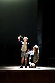 A young Kepler looks through a telescope with his mother, scene from the opera