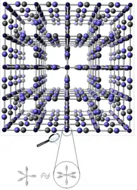 Fig 2: An area of Dunbar's research focuses on molecular magnets. Depicted in Figure 2 is a Prussian Blue analog; a trigonal bipyrimidal cyanide cluster, which shows properties of a molecular magnet, believed to have applications in quantum computing.[9]
