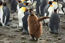 One of the largest known King penguin colonies, on Île aux Cochons in the Crozet Islands, is thought to have experienced a massive drop in its population over the last few decades, from about half a million breeding pairs in the 1980s to about 60,000 breeding pairs in 2017.[15] The cause of this decline may be due to changes in the ecosystem related to climate change as their primary source of food is moving farther away from places where the penguins can breed. This may result in population declines and shifts in the locations of the King penguin breeding grounds.[16]