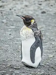 Emperor and king penguins typically do not inhabit the same areas in the wild, with the possible exception of vagrants at sea, but the two can be distinguished from one another by the king's longer, straighter bill, larger flippers, and noticeably sleeker body. The juvenile king penguin with its long bill and heavy dark brown down is completely different in appearance from the mostly grey emperor chick with its black and white mask. Once moulted of its brown juvenile plumage, the king chick resembles the adult, but is somewhat less colourful.