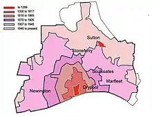 The parishes of Drypool, Marfleet, Sculcoates, and most of Sutton parish, were absorbed within the borough of Hull in the 19th and 20th centuries. Much of their area has been built over, and socially and economically they have long been inseparable from the city. Only Sutton retained a recognisable village centre in the late 20th century, but on the south and east the advancing suburbs had already reached it. The four villages were, nevertheless, distinct communities, of a largely rural character, until their absorption in the borough—Drypool and Sculcoates in 1837, Marfleet in 1882, and Sutton in 1929.[61] The current boundaries of the city are tightly drawn and exclude many of the metropolitan area's nearby villages, of which Cottingham is the largest.[62] The city is surrounded by the rural East Riding of Yorkshire.