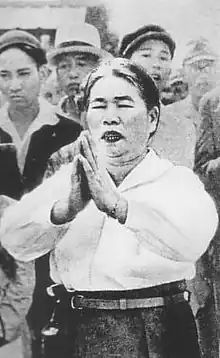 In July 1942, a barn on the Kitamura property burned down. Blaming herself for the incident, Kitamura began visiting a shaman.[3] On May 4, 1944, Kitamura was possessed by a spirit, which was later said to be Tensho Kotaijin.[4] She had her first sermon on July 22, 1945, during which she preached she had been sent to save the world, because it was about to end.[1] She said that people should become "true human beings" in order to create a peaceful "land of god", and that Japan's defeat in World War II was just the prelude to a battle between good and evil.[1] Her sermons included singing and dances of "non-ego", which earned the group the nickname "the dancing religion".