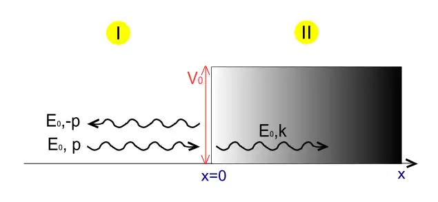 Assuming the particle is propagating from the left, we obtain two solutions — one before the step, in region (1) and one under the potential, in region (2):