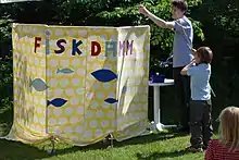 Party activities involve singing and dancing around the Christmas tree, "looting" the tree of ornamental candy and apples, smashing the gingerbread house into pieces and eating it, opening Christmas crackers that have been used as decorations in the tree, lotteries, creating a fiskdamm ("fishing pond") where children will "fish" for toys and candy or a treasure hunt. The songs and dances are essentially the same as those performed at Christmas and Midsummer, and some songs with verses about the end of Christmas, such as Raska fötter springa tripp, tripp, tripp, may especially emphasize such verses.[1][7][8]
