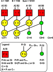An example of a 4-bit Kogge–Stone adder is shown in the diagram. Each vertical stage produces a "propagate" and a "generate" bit, as shown. The culminating generate bits (the carries) are produced in the last stage (vertically), and these bits are XOR'd with the initial propagate after the input (the red boxes) to produce the sum bits. E.g., the first (least-significant) sum bit is calculated by XORing the propagate in the farthest-right red box (a "1") with the carry-in (a "0"), producing a "1". The second bit is calculated by XORing the propagate in second box from the right (a "0") with C0 (a "0"), producing a "0".