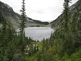 Kokanee Lake is one of over 30 alpine lakes located in British Columbia's Kokanee Glacier Provincial Park. The lake is approximately 1,200 metres (3,900 ft) long and 400 metres (1,300 ft) wide, at an elevation of 1,981 metres (6,499 ft) and located at the head of Kokanee Creek.[1] It is fed by the Kokanee Glacier and is the headwater of Kokanee Creek. Access is possible via the Gibson Lake trailhead, from which Kokanee Lake is a four-kilometre (2.5 mi) hike. Fishing is permitted and the lake is usually stocked with cutthroat trout.