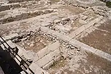 During the Diocletianic Persecution, Philoneides, the Bishop of Kourion, was martyred. In 341 CE, the Bishop Zeno was instrumental in asserting the independence of the Cypriot church at the Council of Ephesus. In the later-4th century (365-370), Kourion was hit by five strong earthquakes within a period of eighty years, as attested by the archaeological remains throughout the site, presumably suffering near-complete destruction.[11] In the late fourth and early fifth centuries, Kourion was reconstructed, though portions of the acropolis remained abandoned. The reconstruction included the ecclesiastical precinct on the western side of the acropolis. In 648-49, Arab raids resulted in the destruction of the acropolis, after which the centre of occupation was relocated to Episkopi, 2 km to the northeast. Episkopi was named for the seat of the bishop (Episcopus).[10][12][13]