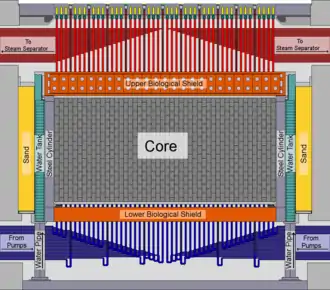 The reactor vessel has on its outer side an integral cylindrical annular water tank,[12] a welded structure with 3cm thick walls, an inner diameter of 16.6m and an outer diameter of 19m, internally divided to 16 vertical compartments. The water is supplied to the compartments from the bottom and removed from the top; the water can be used for emergency reactor cooling. The tank contains thermocouples for sensing the water temperature and ion chambers for monitoring the reactor power.[13] The tank, along with an annular sand layer between the outer side of the tank and inner side of the pit,[8] and the relatively thick concrete of the reactor pit serve as lateral biological shields.