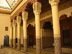 The Marrakech Museum is located in the old centre, housed in the Dar Menebhi Palace, built at the beginning of the 20th century by Mehdi Menebhi.[106][107] The palace was carefully restored by the Omar Benjelloun Foundation and converted into a museum in 1997.[108] The house itself represents an example of classical Andalusian architecture, with fountains in the central courtyard, traditional seating areas, a hammam and intricate tilework and carvings.[109] It has been cited as having "an orgy of stalactite stucco-work" which "drips from the ceiling and combines with a mind-boggling excess of zellij work."[109] The museum's large atrium (originally a courtyard, now covered in glass and fabric) contains a very large centrally hung chandelier consisting of metal plates decorated with fine geometric and epigraphic cuttings. Several features of the original courtyard, including the floor-set basins and mosaics have been retained. The museum holds exhibits of both modern and traditional Moroccan art together with fine examples of historical books, coins and pottery of Moroccan Jewish, Berber and Arab cultures.[110][111]