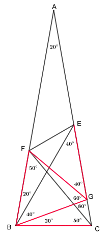 A direct proof using classical geometry was developed by James Mercer in 1923.[2] This solution involves drawing one additional line, and then making repeated use of the fact that the internal angles of a triangle add up to 180° to prove that several triangles drawn within the large triangle are all isosceles.