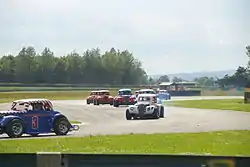 Legends car racing is a style of auto racing designed primarily to promote exciting racing and to keep costs down. The race car bodyshells are 5/8-scale replicas of American automobiles from the 1930s and 1940s, powered by Yamaha XJ1250, FJ1200 (both air-cooled) or, starting in 2018, FZ09 (water-cooled) engines. The worldwide sanctioning body for legends car racing is INEX.