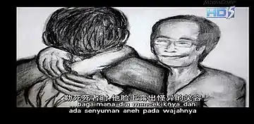 A scene from a documentary depicts a sketch of Leong (right, bespectacled) demonstrating in court how he strangled Liu with the towel, and Leong's lawyer Sunil Sudheesan portrays as the victim Liu in this demonstration. The Chinese and Malay subtitles below the scene, when translated to English, meant: "... strangled the deceased (Liu), he (Leong) had a strange smile on his face."