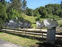 Leuschner Observatory is home to a single 3.6-metre (12 ft) radio telescope. The telescope was one of the prototypes for the Allen Telescope Array that were tested at Leuschner, and has since been used in the undergraduate radio astronomy lab.[7] The telescope operates between 1320–1740 MHz and uses an 8192 element spectrometer with spectral resolution of about 1.5 kHz and a 12 MHz bandwidth. The operating range allows for it to be used to observe the 21-cm hydrogen line as well as hydroxyl lines from astrophysical masers.[10]