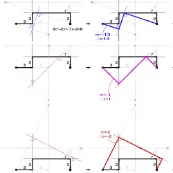 In this example with 3x3+2x2−7x+2, the polynomial's line segments are first drawn on a sheet of paper (black). Lines passing through reflections of the start and end points in the second and third segments, respectively (faint circle and square), and parallel to them (grey lines) are drawn.