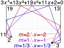 Finding roots −2, −1 (repeated root), and −1/3 of the quartic 3x4+13x3+19x2+11x+2 using Lill's method. Black segments are labeled with their lengths (coefficients in the equation), while each colored line with initial slope m and the same endpoint corresponds to a real root.