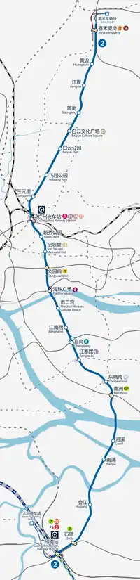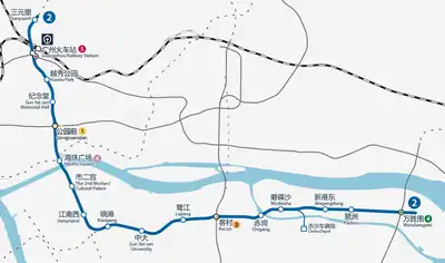 Line 2 of the Guangzhou Metro is a north–south line on the system that runs from Guangzhou South Railway Station to Jiahewanggang, with a total length of 31.4 km (19.51 mi) with 24 stations. All stations in Jiahe Line are underground.[4] Line 2's color is blue.