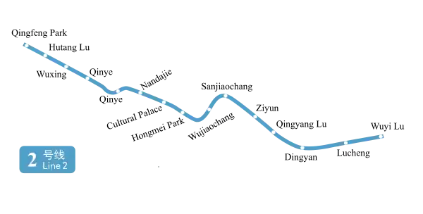It follows Xinggang Road from Qingfeng Park to Wuxing. It then continues under Qinye Road until Qinye, then turns onto Laodong West Road, approaching Huaide. At Nandajie, the line veers under Yanling West Road, interchanging with Line 1 at Cultural Palace, turning onto Feilong East Road at Hongmei Park. At Sanjiaochang, it again turns onto Dongfang Avenue, where it continues until Wuyi Lu.