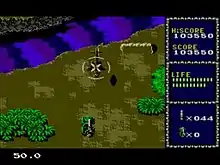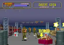 The game is played from a first person perspective, with two cabinet-mounted positional guns used to shoot enemies on the screen. There are eight stages which take place in various settings, including the enemy base, jungle, canyons, desert and ruins.[7] At the end of each is a boss vehicle which must be destroyed in order to progress. Ammunition is limited to a few clips of bullets for the machine gun, a small supply of hand grenades and a screen clearing missile, although additional supplies can be obtained by shooting the relevant icon when they appear during play.[8]